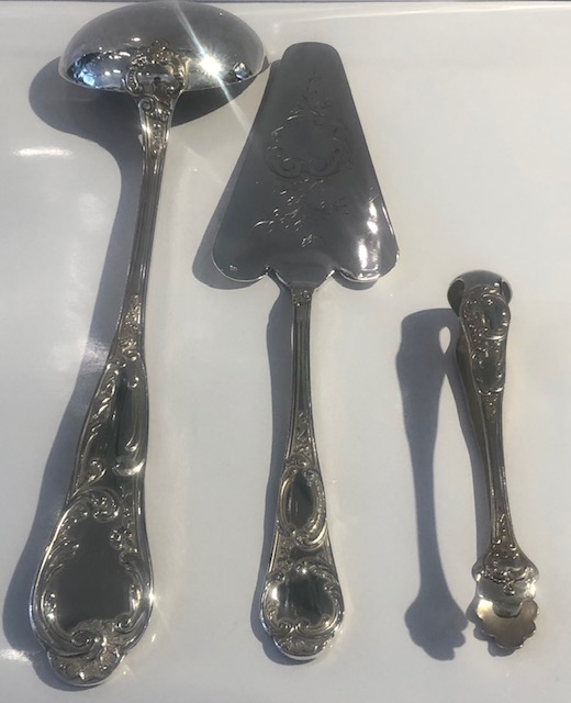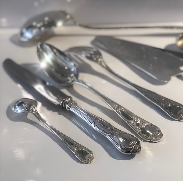 Cet ensemble de couverts ciselés, façon Louis XV, comprend 51 pièces.