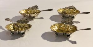 Cet ensemble de salerons date du XIXème. Ils sont en argent massif et les intérieurs en vermeil.