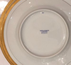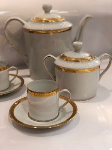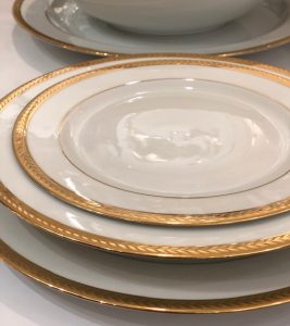 Argenterie d’Antan vous propose un service de table ainsi qu’un service à café, en porcelaine de Limoges, à décor de liserets dorés à la feuille d’or représentant des feuilles de laurier, style second empire.