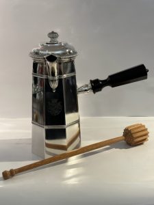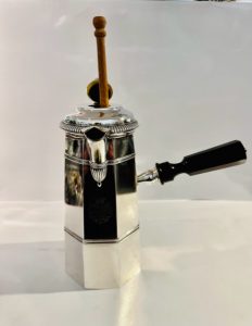 Cette chocolatière, de la prestigieuse maison Cardeilhac, est en argent massif, son intérieur en vermeil.
