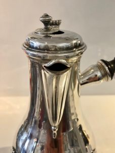 Jolie chocolatière, en argent massif, tripode avec mantelet pour recevoir un moussoir permettant de remuer le délicat breuvage.