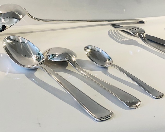 Cet ensemble, Filet contours, comprend 85 pièces, en parfait état, dont les couteaux, du même modèle, sont en ivoire, d’une qualité exceptionnelle.