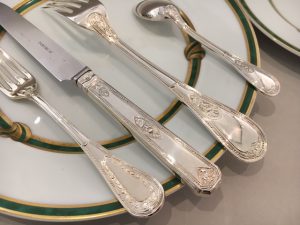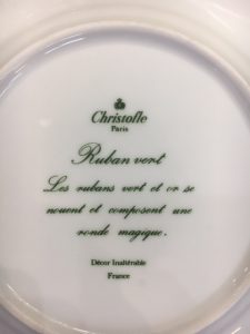 Cette ménagère est posée sur une assiette en porcelaine signée Christofle, modèle Ruban Vert.