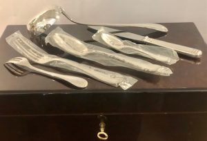 Cet ensemble, en parfait état, est dans un coffre en Loupe d’Orme et comprend 61 pièces :